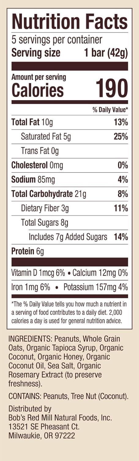 Bob’s Red Mill 5pk PB Honey & Oats Bar, 5 bars (Pack of 1) – Non GMO, Gluten Free, Kosher(Coconut)