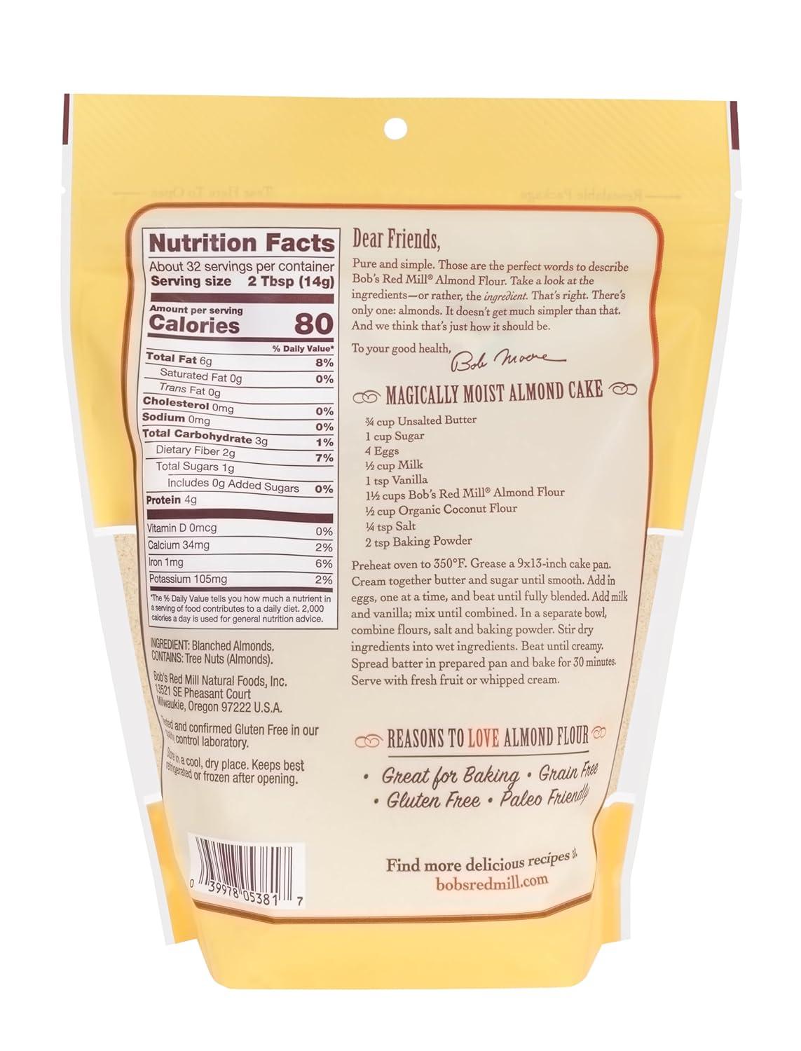 Share good ingredients for all! Bob’s Red Mill Almond Flour is made from premium California-grown almonds, finely ground to create a superior gluten free, low-carb flour. Perfect for paleo, keto and grain free baking, it adds a rich, buttery flavor and moist texture to your favorite recipes. Use as a breading for meats and vegetables or to replace breadcrumbs in meatballs. Expertly milled for homemade perfection—every time—this premium gluten free flour is the ideal ingredient to share with loved ones with celiac or a gluten intolerance.