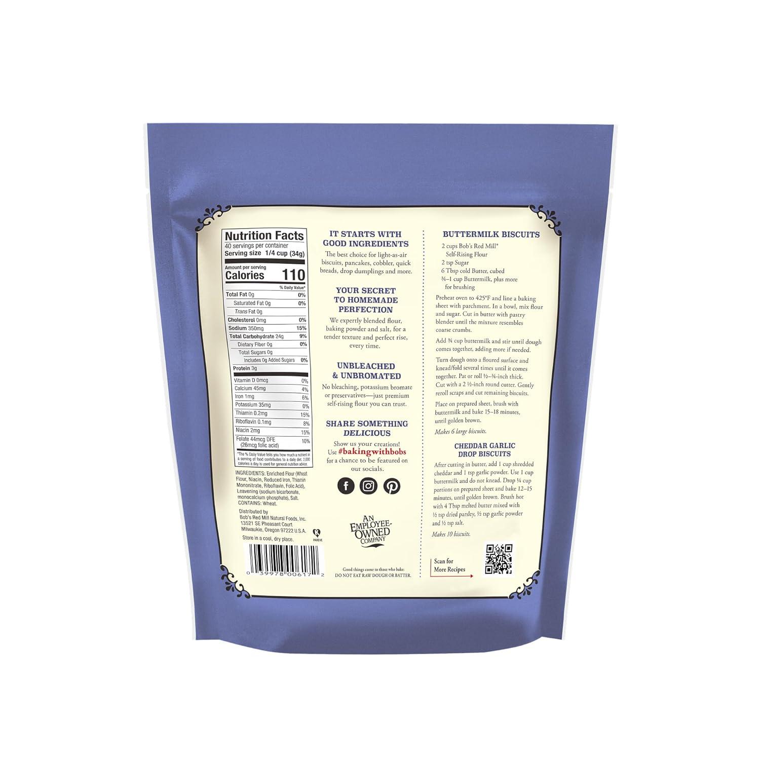 Enjoy perfectly fluffy biscuits, pancakes and quick breads—no extra measuring required. Bob’s Red Mill Self-Rising Flour combines our premium all-purpose flour with baking powder and salt for an all-in-one blend that takes the guesswork out of baking. Each batch is expertly mixed to ensure a tender texture and consistent rise in every recipe. Whether you’re whipping up a quick weeknight treat or preparing a holiday brunch, it delivers reliable, delicious results with ease. From savory biscuits to sweet breakfast favorites, it’s a pantry staple that saves time without sacrificing quality. Just scoop, mix and bake for homemade goodness in minutes. It’s perfect for both seasoned bakers and beginners looking for foolproof results. With Bob’s Red Mill Self-Rising Flour, making something to share has never been simpler.
